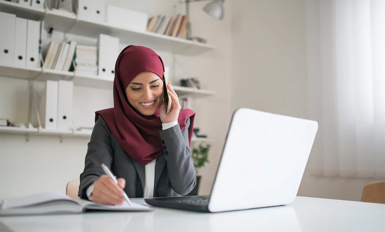 A seated woman writes in her notepad while talking on the phone next to her laptop.